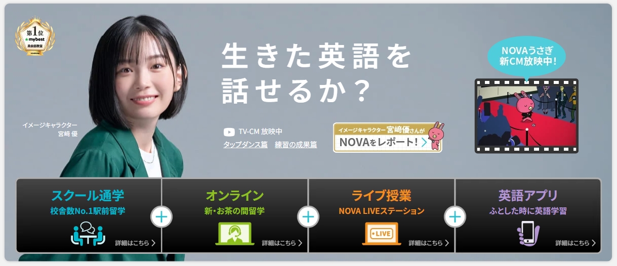 NOVAは、「駅前留学」の愛称で知られる英会話スクールで、全国各地の駅前に教室を展開しています。対面レッスンに加え、自宅から受講できるオンライン英会話「お茶の間留学」にも対応しており、ライフスタイルに合わせた学び方が可能です。